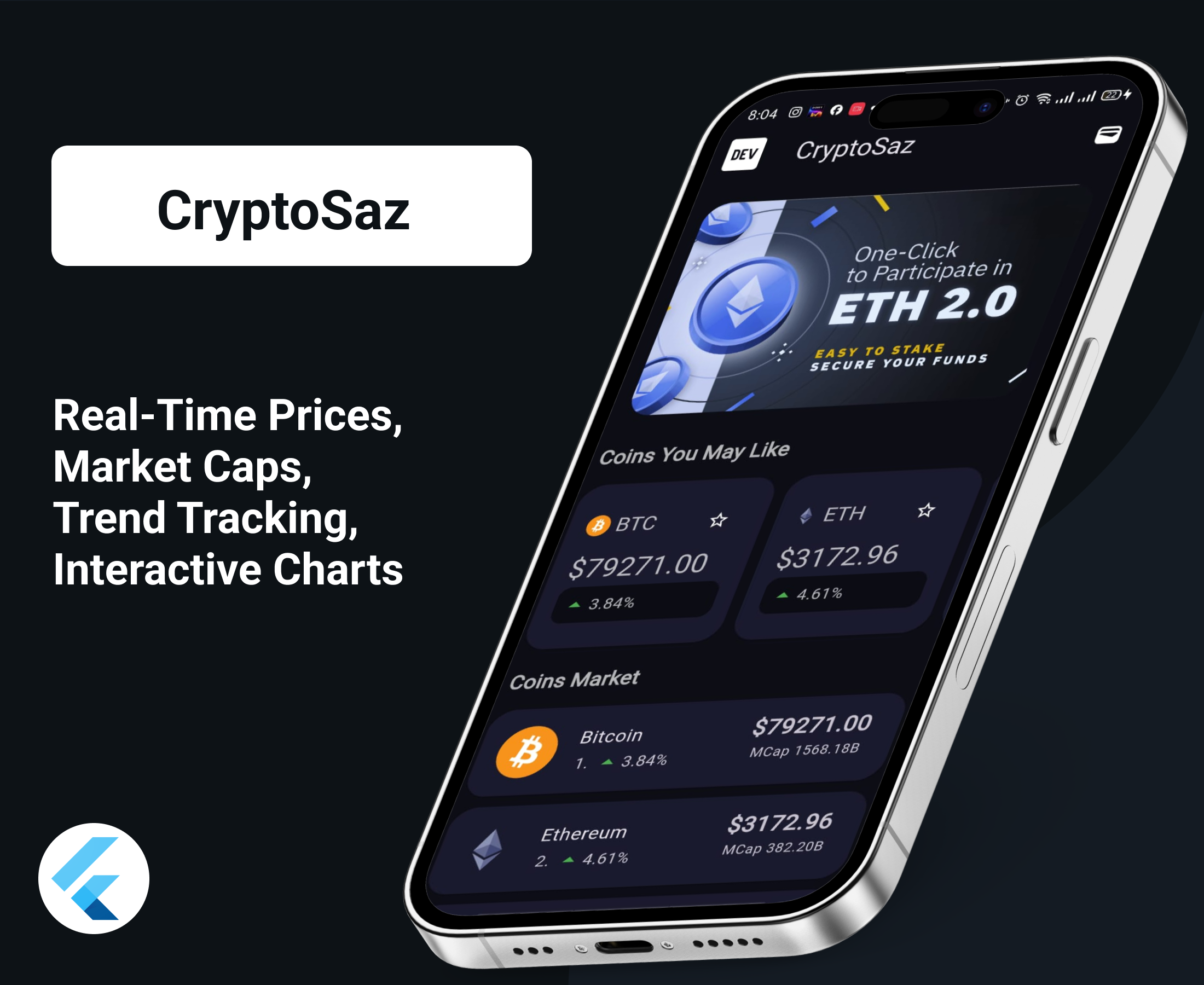 CryptoSaz is a feature-rich crypto market app, providing live data on coin market caps, prices, and trends. Designed for easy access to real-time cryptocurrency insights.