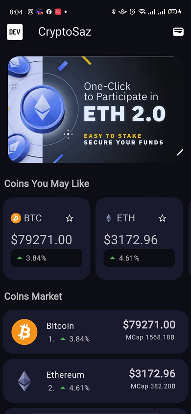CryptoSaz is a feature-rich crypto market app, providing live data on coin market caps, prices, and trends. Designed for easy access to real-time cryptocurrency insights.