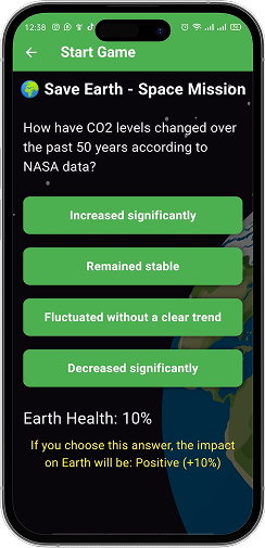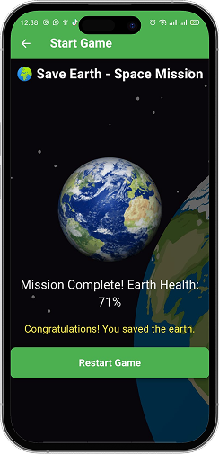 Save Earth Game is an interactive, choice-driven experience that challenges players to make decisions on real-world environmental issues. With real-time feedback, players see the direct positive or negative impact of their actions on Earth’s health. Engaging and educational, it fosters awareness of sustainability and empowers players to take meaningful actions.